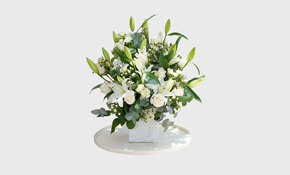 White lilies and soft pastel bouquets express condolences and respect.